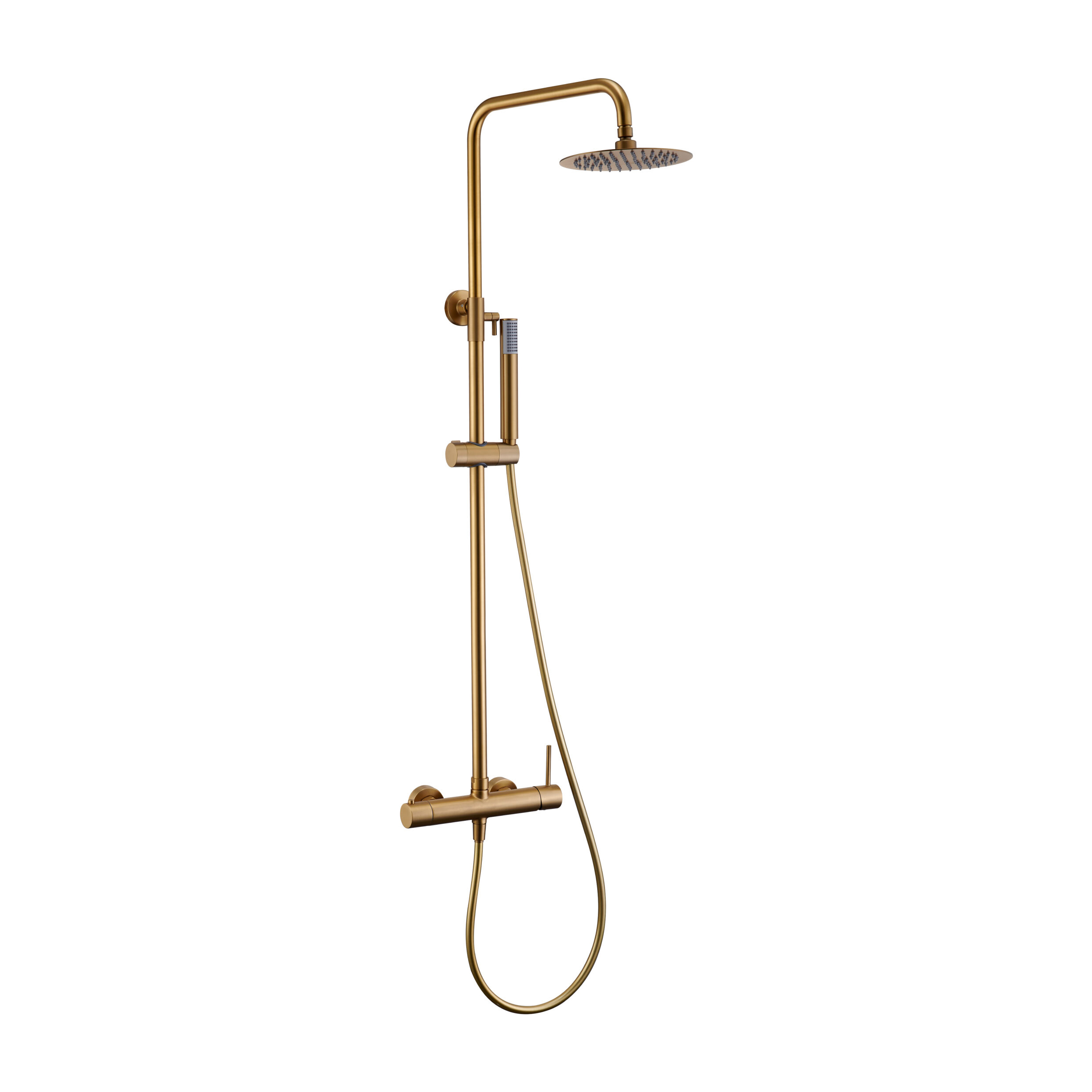 Rociador de acero inox. S.304 Ø20cm, extraplano, acabado oro cepillado y antical. Soporte mango de ducha regulable en altura.
